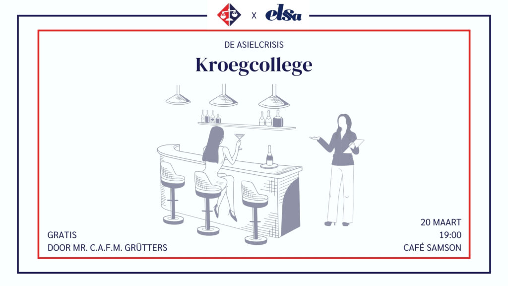 Donderdag 20 maart hebben wij samen met ELSA (European Law Students’ Association) een kroegcollege georganiseerd.❤️💙 Tijdens dit kroegcollege zal mr. C.A.F.M. Grütters, onderzoeker aan de RU, ons meenemen in het asielrecht en hier meer over vertellen. 🌍
