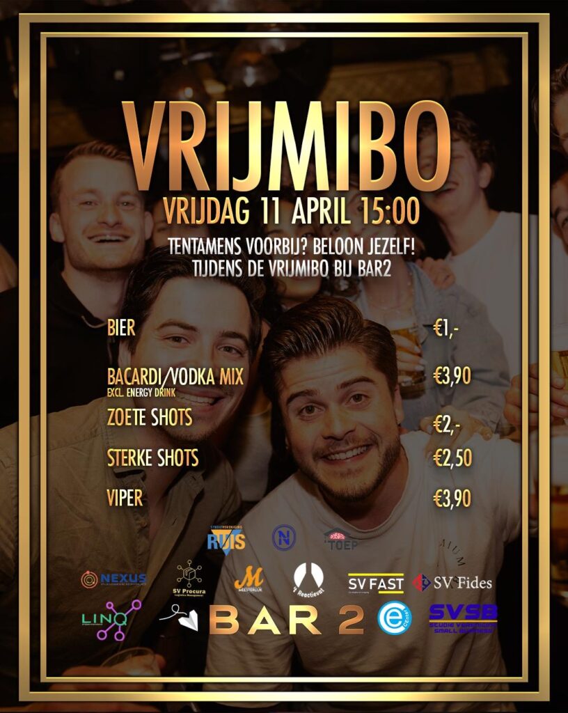 Het zonnetje schijnt, de tentamens lopen op z’n eind, dat kan maar één ding betekenen!☀️ Een VrijMiBo op de planning. Vrijdag 11 april schudden we samen de tentamenstress van ons af bij BAR2.💃🏼