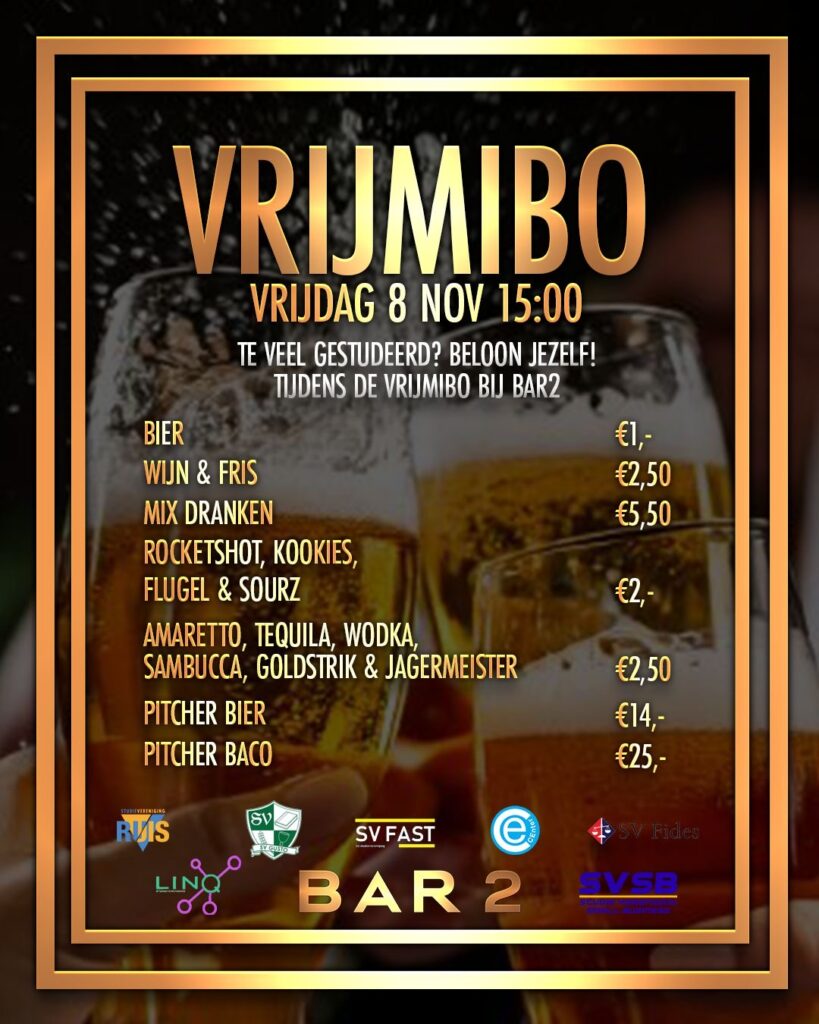 Na het gezwoeg van de afgelopen periode is het hoogstens tijd om even goed te ontspannen.😎 Hoe kan dit beter dan tijdens de VrijMiBo op 8 november bij BAR2!🕺