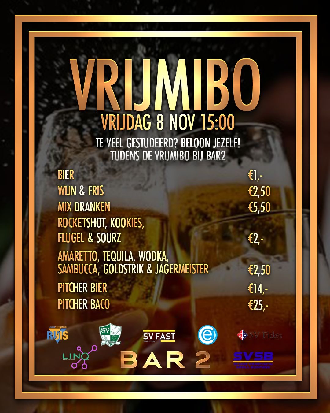 BAR 2 Molenstraat 83, NijmegenLieve allemaal,❤️💙 Na het gezwoeg van de afgelopen periode is het hoogstens tijd om even goed te ontspannen.😎 Hoe kan dit beter dan tijdens de VrijMiBo op 8 november bij BAR2!🕺 Nog even succes met de aankomende tentamens en dan zien we jullie daar!🤩
